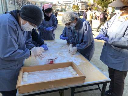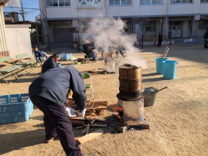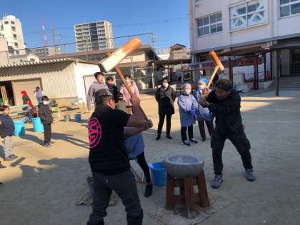 新年の青空のもと、もちつき大会が始まりました。PTA.地域の皆様が、昨日から準備してくださいました。