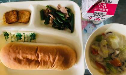 白菜のクリーム煮、あつあげのピリ辛じょうゆかけ、豚肉とさんどまめのオイスターソースいため、コッペパン、ソフトマーガリン、牛乳 です。