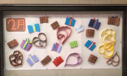 早いもので、今日から2月になりました。玄関掲示も模様替え。今回は2年生が、2月の玄関掲示を何にしたいか、学級会で話し合い、自分たちでつくりあげました。