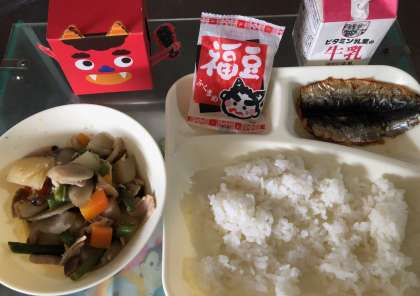 いわしのしょうがじょうゆかけ、含め煮、いり大豆、ごはん、牛乳 です。