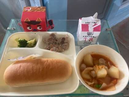 鶏肉のバジル焼き、ウインナーと野菜のケチャップ煮、ブロッコリーのサラダ、コッペパン、アプリコットジャム、牛乳