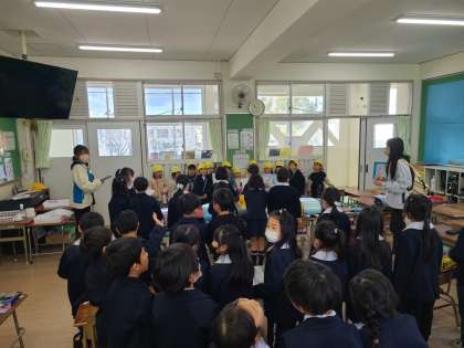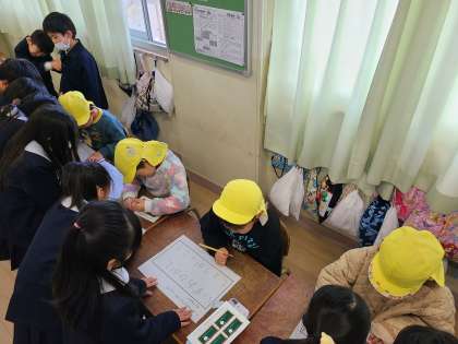 今日は千島保育所の年長さんをお迎えして、1年生が交流会をしました。お勉強体験や昔遊び体験など1年生が先生役になって、やさしく教えていました。みんな、お兄さんお姉さんになりました!
