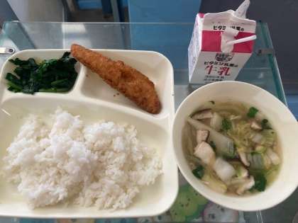 本日の献立 たらフライ、うすくず汁、ほうれんそうのおひたし、ごはん、牛乳