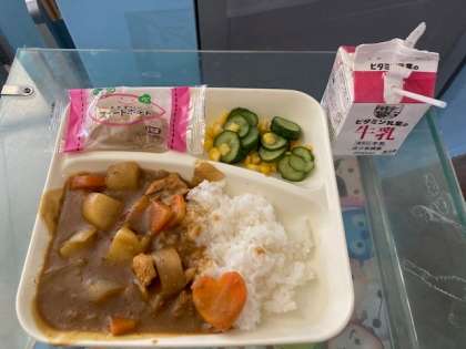 本日の献立 チキンレバーカレーライス、きゅうりとコーンのサラダ、スイートポテト、ごはん、牛乳