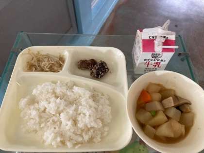 くじらのたつたあげ、まる天と野菜の煮物、もやしのしょうがづけ、ごはん、牛乳