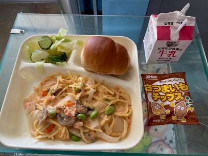 さけのクリームスパゲティ、キャベツときゅうりのサラダ、おさつチップス、1/2こくとうパン、牛乳
