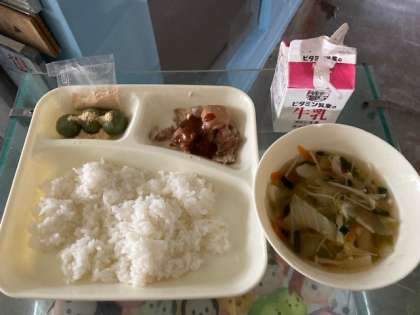 鶏肉のみそバターソース、五目汁、きな粉よもぎだんご、ごはん、牛乳