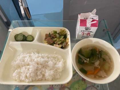 ホイコウロー、中華スープ、きゅうりのピリ辛あえ、ごはん、牛乳