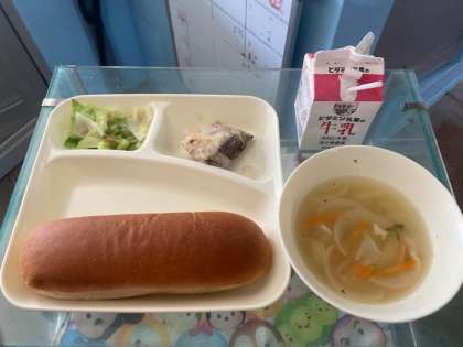 かつおのガーリックマリネ焼き、押麦スープ、キャベツとベーコンのソテー、こくとうパン、牛乳