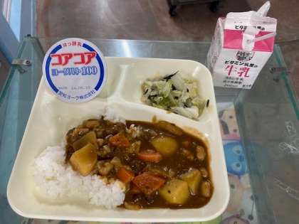本日の献立 牛肉と大豆のカレーライス、キャベツのひじきドレッシング、ヨーグルト、ごはん、牛乳