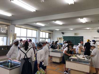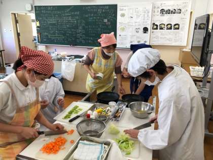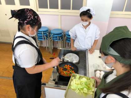 6年生が、調理実習で三色野菜炒めとスクランブルエッグをつくっていました。