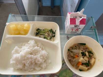 本日の献立 中華煮、チンゲンサイともやしのしょうがあえ、りんご(缶詰)、ごはん、牛乳