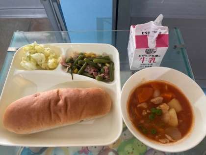 ケチャップ煮、ベーコンとさんどまめのソテー、キャベツのバジル風味サラダ、レーズンパン、牛乳