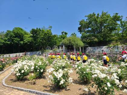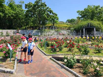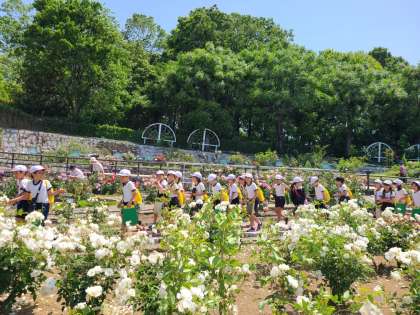 バラ園を歩きました。たくさんの種類のきれいなバラがありました。