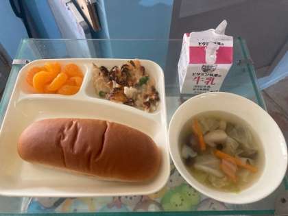 本日の献立 マカロニグラタン、キャベツのスープ、みかん(缶詰)、こくとうパン、牛乳