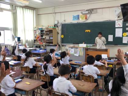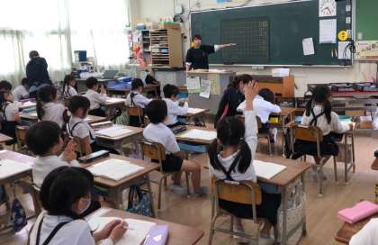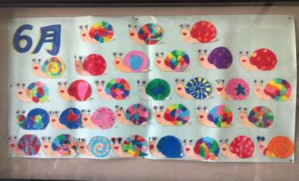 玄関掲示はかわいいカタツムリに模様替え。1年生の作品です。入学式から2ヶ月が過ぎ、学習にも意欲的に取り組んでいます。