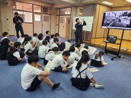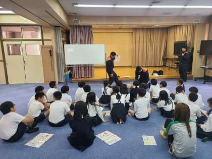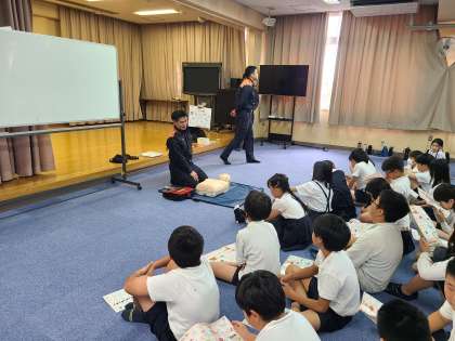 大正消防署の方々が来てくださり、5年生が応急手当と救命処置について学習しました。隊員の方のお話とDVD で手順を確認しました。みんな真剣に聞いたり見たりしていました。