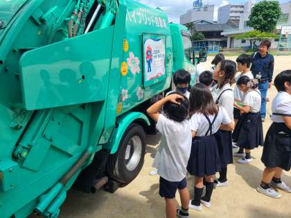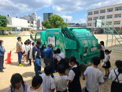 環境事業局の方が来てくださり、4年生がゴミやリサイクルについて学習しました。パッカー車を実際にみたり、3Rについてのお話をきいたり、たくさんの学びがありました。みんな積極的に挙手して発表していました!グループでもみんなで協力して活動していました!学習意欲いっぱいの4年生です!