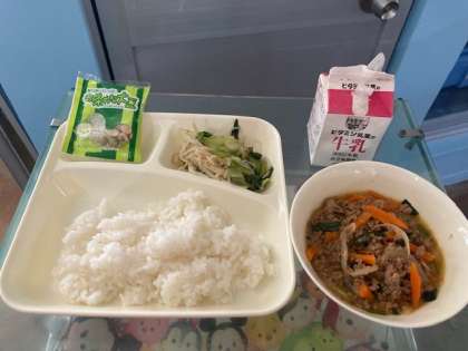 本日の献立 マーボーはるさめ、チンゲンサイともやしの甘酢あえ、まっ茶大豆、ごはん、牛乳