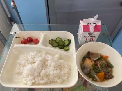 牛肉と野菜のいため煮、きゅうりのしょうがづけ、さくらんぼ、ごはん、牛乳