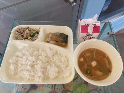 本日の献立 さごしのおろしじょうゆかけ、みそ汁、野菜いため、ごはん、牛乳
