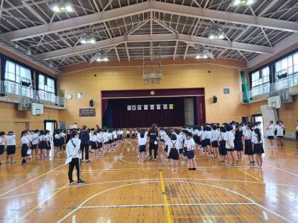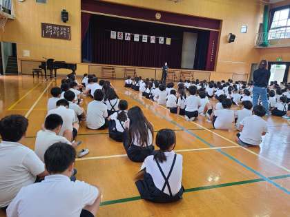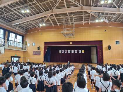 今朝は月に一度の全校朝会です。運動場の状態が悪く講堂で行いました。校長先生からは、新紙幣の津田梅子さんにちなんだ「続けることのむずかしさ、大切さ」のお話がありました。7月の生活目標は「ていねいなことばをつかおう」です。友だちや先生、大人の人など、相手に合わせた言葉、相手のことを考えた言葉をつかえるよう、日々意識してはしいと思います。