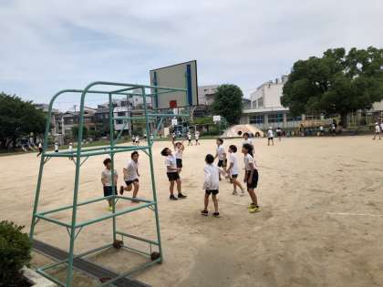 チャイムと同時に「よっしゃー!」と運動場に出てきた子どもたち。蒸し暑さもなんのその。元気いっぱい遊んでいます。