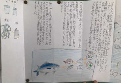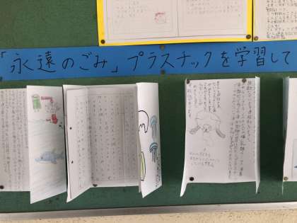 職員室の前の掲示板には、子どもたちの学習のがんばりを掲示しています。今月は6年生。国語科で学習した「永遠のごみ プラスチック」から、プラスチックごみ問題について調べたり考えたりしたことをまとめたリーフレット。それと、自学ノートを紹介しています。