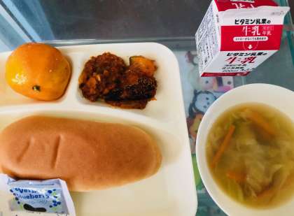かぼちゃのミートグラタン、鶏肉と野菜のスープ、冷凍みかん、コッペパン、ブルーベリージャム、牛乳 です。