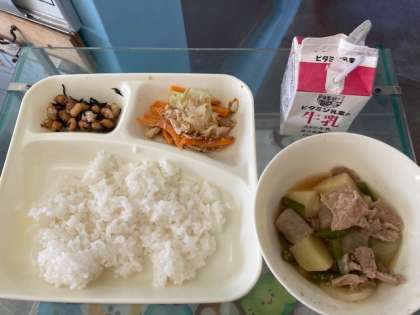 本日の献立 豚肉とじゃがいもの煮もの、ひじき豆、ささみと野菜のごまみそ焼き、ごはん、牛乳