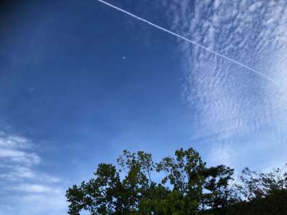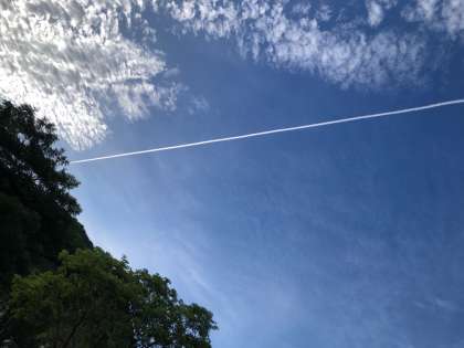飛行機雲が、くっきりときれいです。写っていないでしょうが、トンボが群れをなして飛んでいます。