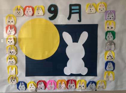 9月になり、玄関掲示も模様替え。かわいいうさぎたちが、お月見をしています。