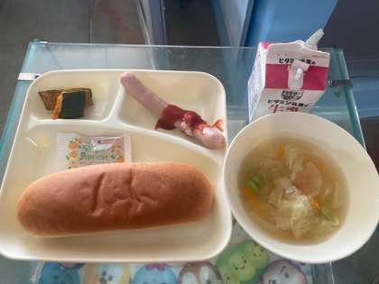 ウインナーのケチャップソース、スープ、焼きかぼちゃ、コッペパン、アプリコットジャム、牛乳