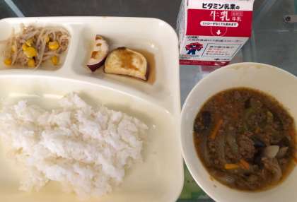 マーボーなす、ツナと野菜の炒めもの、焼きさつまいもの甘みつかけ、ごはん、牛乳 です。