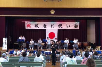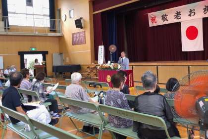 泉尾東地域の敬老お祝い会が本校講堂で開催され、70歳以上の方々が参加されました。