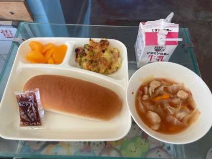 カレーマカロニグラタン、トマトスープ、みかん(缶詰)、コッペパン、いちごジャム、牛乳