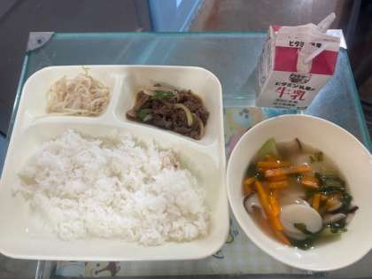 本日の献立 プルコギ、トック、もやしのナムル、ごはん、牛乳