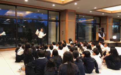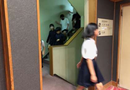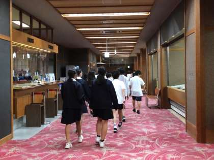 部屋割りの後はすぐに避難訓練です。もしもの時に、経路を確認し、速やかに避難しました。