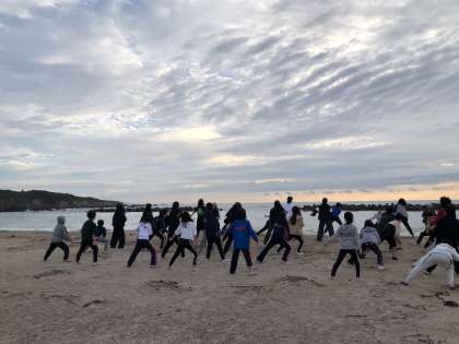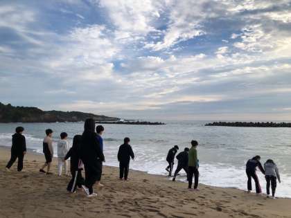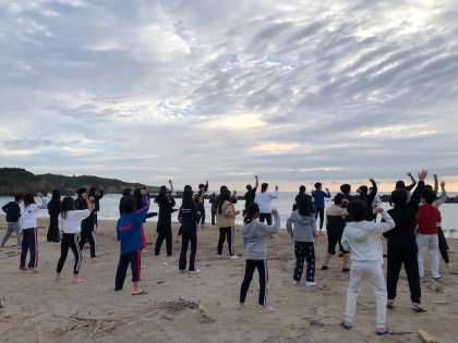 朝の集いでは、目覚めのラジオ体操、でなく、海に向かってソーラン節を踊りました。