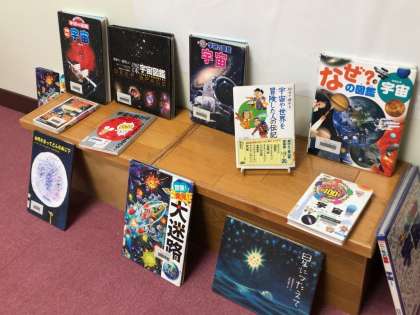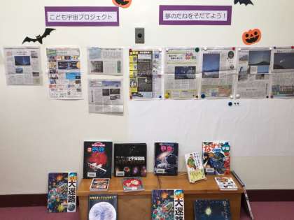子ども宇宙プロジェクトにリンクした宇宙の本のコーナーには、子どもたちが切り抜いた宇宙に関する新聞記事が。