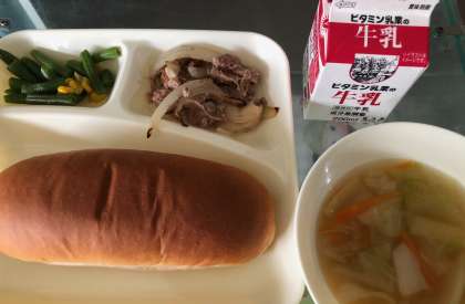 豚肉のガーリック焼き、鶏肉と野菜のスープ、三度豆とコーンのソテー、黒糖パン、牛乳 です。