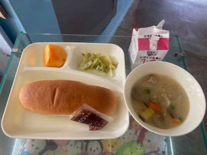 鶏肉とさつまいものシチュー、はくさいのピクルス、柿(平核無柿)、コッペパン、いちごジャム、牛乳