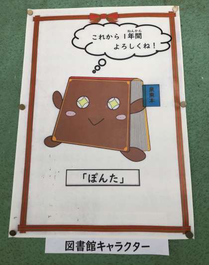 読書週間に募集していた図書館キャラクター。たくさんの応募がありました。図書委員会での厳正な審査の結果、「ぽんた」が選ばれました。子どもたちがますます本が大好きになるように、活躍してくれると思います。