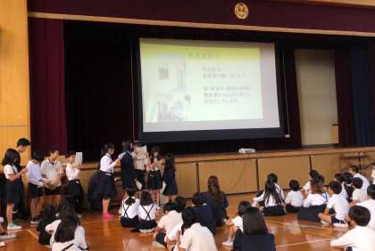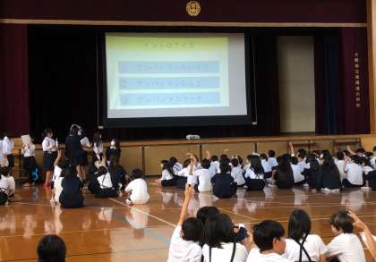 今日の児童集会は、放送委員会の発表でした。放送委員会の仕事の内容や、放送室の設備の紹介がありました。