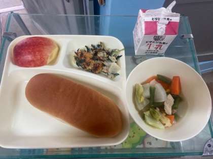 ほうれんそうのグラタン、スープ煮、りんご、こくとうパン、牛乳
