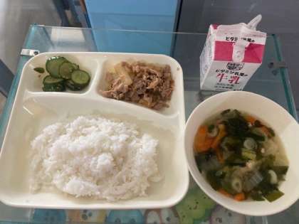 本日の献立 豚肉のコチュジャン炒め、鶏肉とはるさめのスープ、きゅうりのナムル、ごはん、牛乳