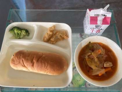 白身魚フリッター、ミネストローネ、ブロッコリーのサラダ、おさつパン、牛乳
