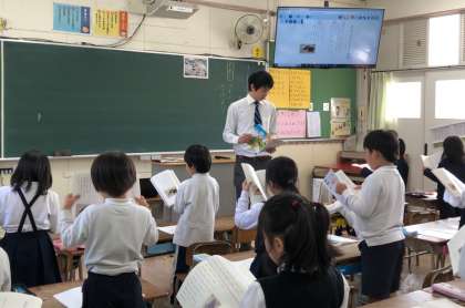 1年生で国語科の研究授業を行いました。「子どもをまもるどうぶつたち」で、コチドリの親が、どんな知恵を使って子どもを守っているのか読み取り、すごいと思ったことを理由とともに書き表しました。