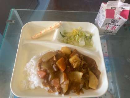 豚肉と金時豆のカレーライス、はくさいのピクルス、棒チーズ、ごはん、牛乳