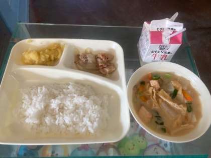 本日の献立 鶏肉の塩こうじ焼き、かす汁、栗きんとん、ごはん、牛乳